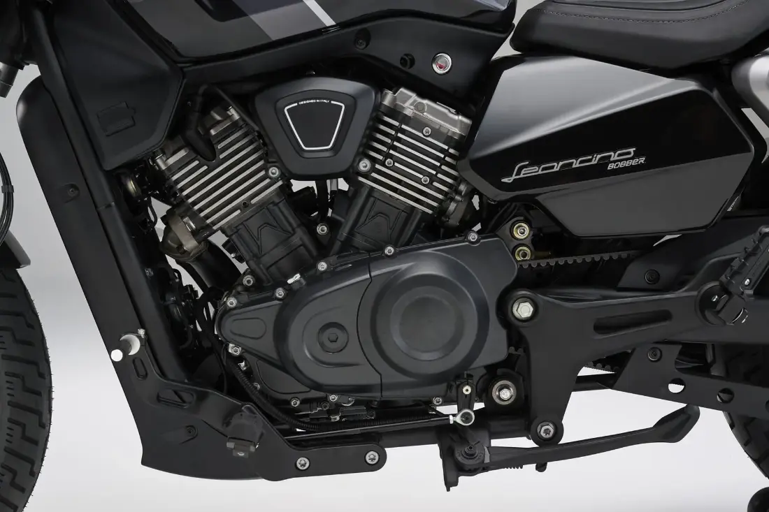 El motor bicilíndrico en V a 60°, homologado Euro 5+, es también una novedad absoluta para Benelli y destaca como elemento de diseño en sí mismo. Esto se aprecia en los detalles, como las aletas decorativas de refrigeración que enriquecen el motor refrigerado por líquido, y en el filtro de aire transparente, que llama la atención y se convierte en una característica distintiva del modelo.